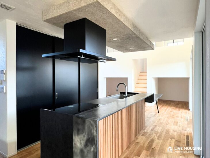 天井の素材(木毛セメント板)感と、一体化したレンジフードや、陰影を生む縦格子のデザインが空間にリズムを与えます。背面の収納スペースだけでもなく水回りもあわせた動線上に収納とルンバ基地も設けられ動線の合理性とデザイン性を両立しています。