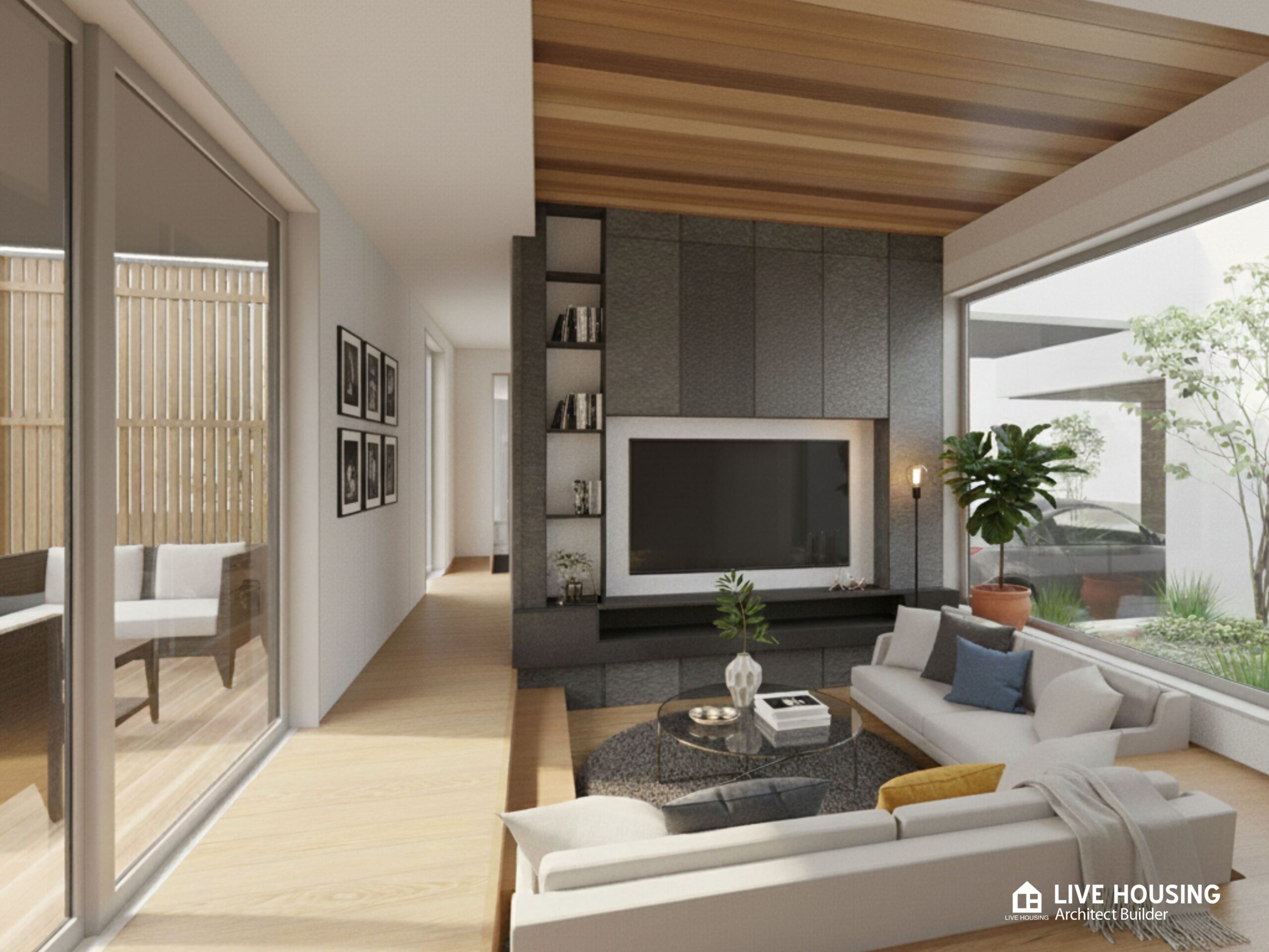 家族がゆったりと過ごせる、心地よい光と風の通り道。外からの視線をやわらかく遮りながら、内に広がる開放的な空間設計。