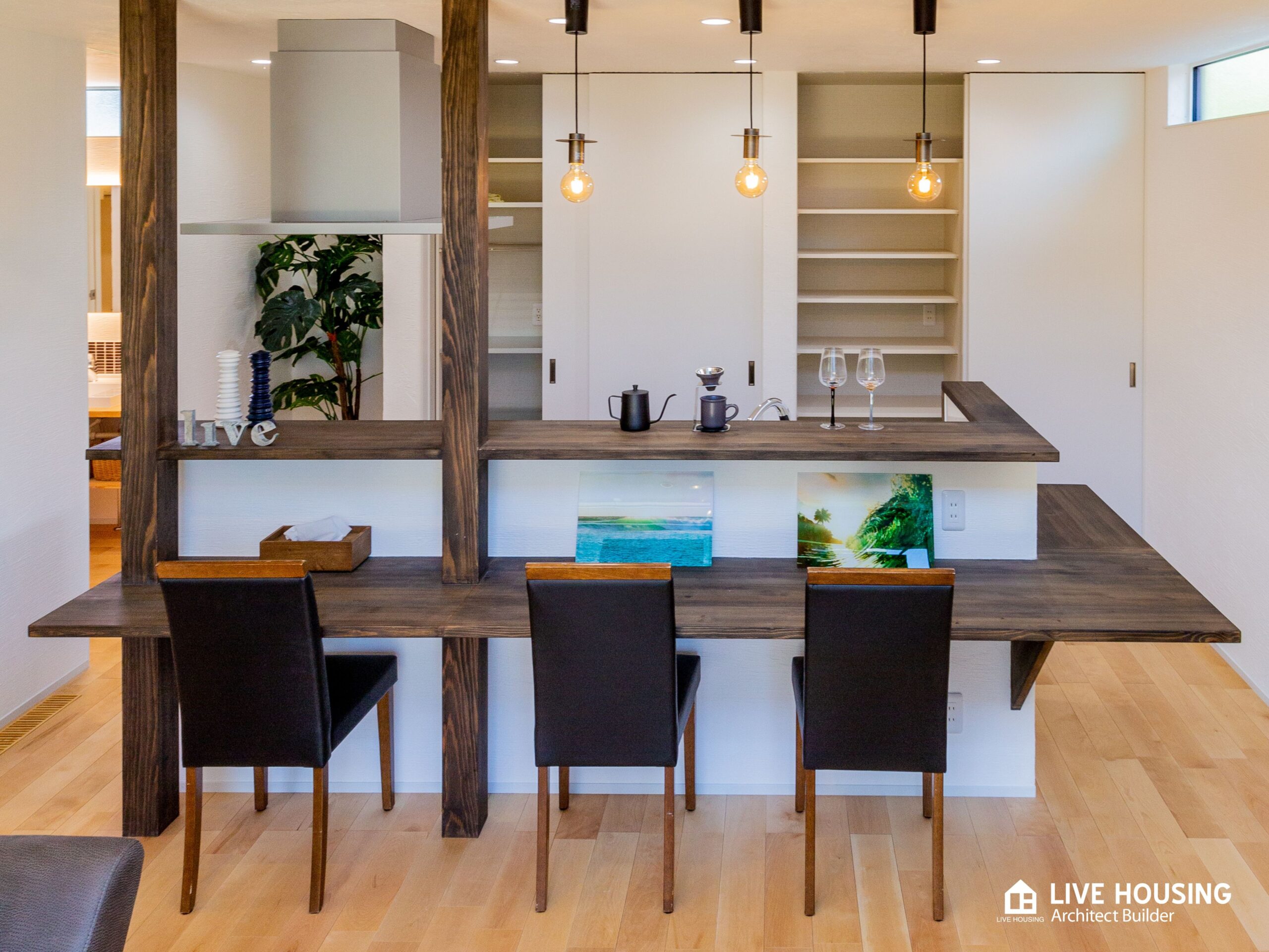 カウンターでは子供たちが宿題をしたり、パパとママがコーヒーを楽しんだり。背面に二段棚を設け、「単に食事をつくる作業空間」ではなく、家族の日常が特別な風景に変わる、そんな魔法のような場所。