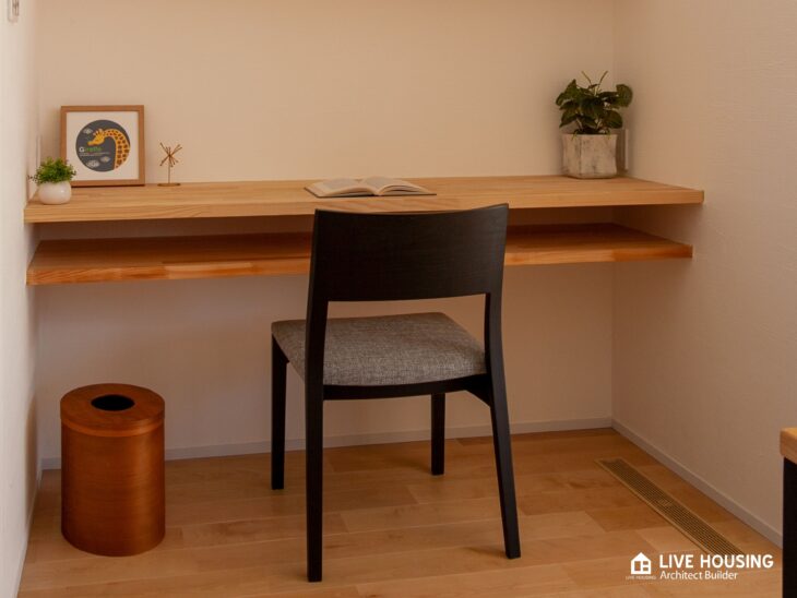 • リビングのすっきり感を維持: テレビ周りに物が溢れないよう、収納と作業スペースを壁の裏側に集約することで、リビング全体の「カフェ風」の雰囲気を守っています。