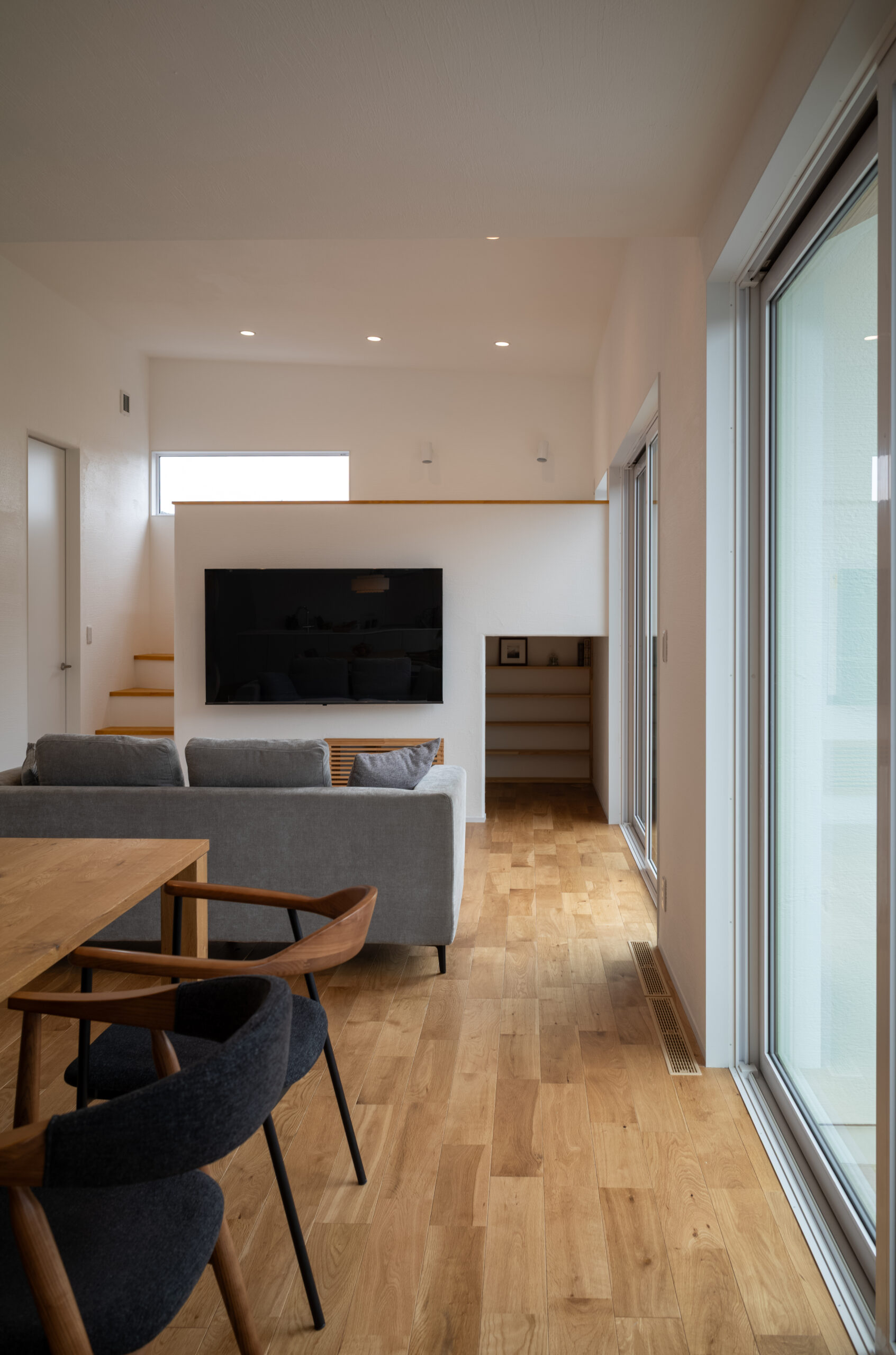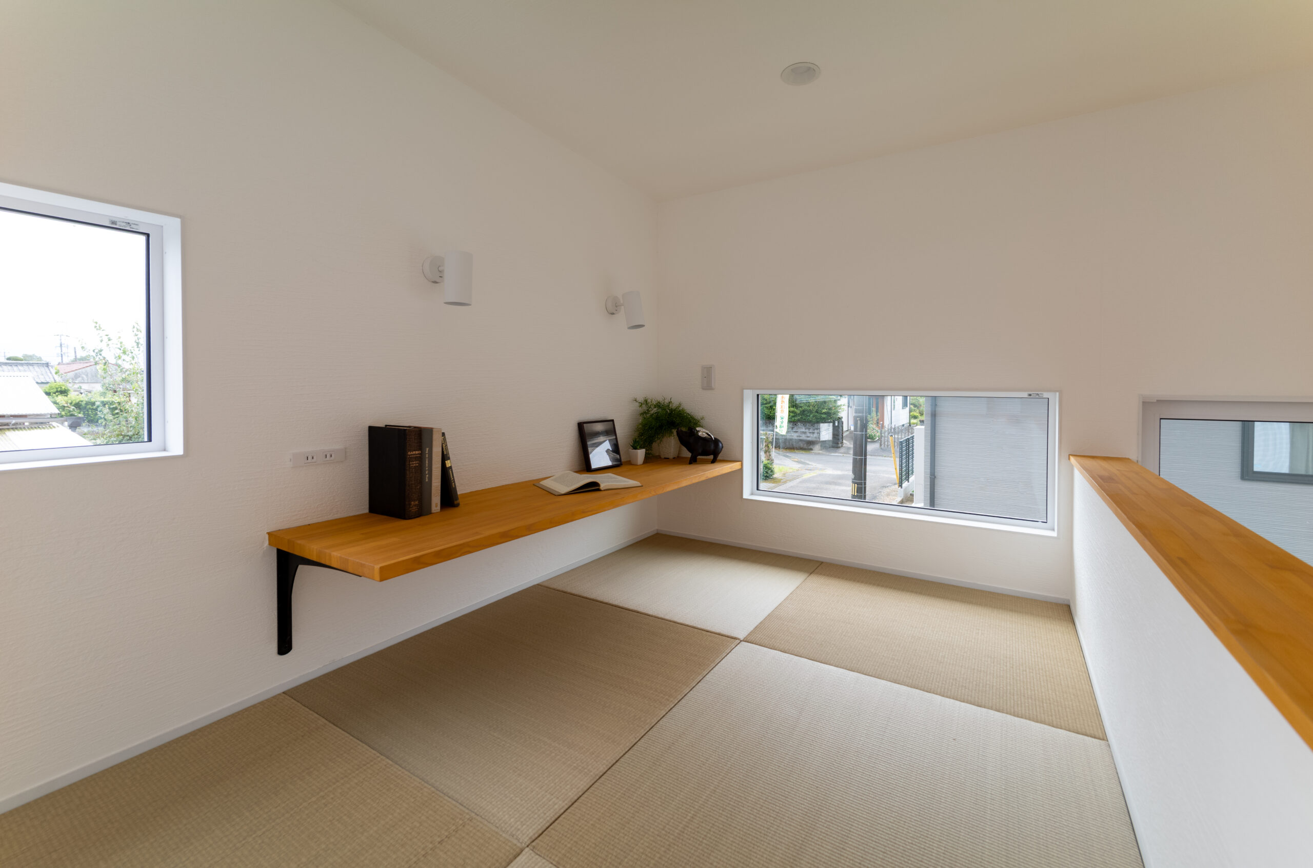 天井高約3.5mの開放的なリビングには、畳敷きの中二階スペースを設置しました。ゴロンと寝転がってリラックスしたり、お子様がパソコンを開いて宿題をしたりと、多目的に使える気持ちの良い空間です。少し高い位置にあるため、キッチンに立つお母さんとも目線が合いやすく、中二階のおもちゃや勉強道具が多少散らかっていても下からは見えないという、お互いにとって心地よい距離感が魅力です。