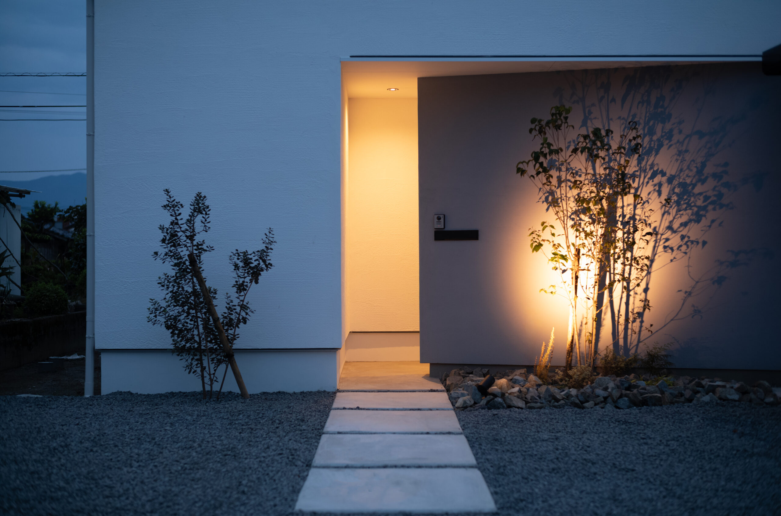 西日対策を施した外観は、真っ白な漆喰に斜めのグレーの壁がアクセントを添えるシンプルで可愛らしいデザイン。玄関扉をあえて通りから見えない位置に配置することで、プライバシーを確保しつつ、外観デザインをよりスタイリッシュに引き締めています。夜には植栽がライトアップされ、訪れる人を優しく迎えるアプローチに仕上がりました。