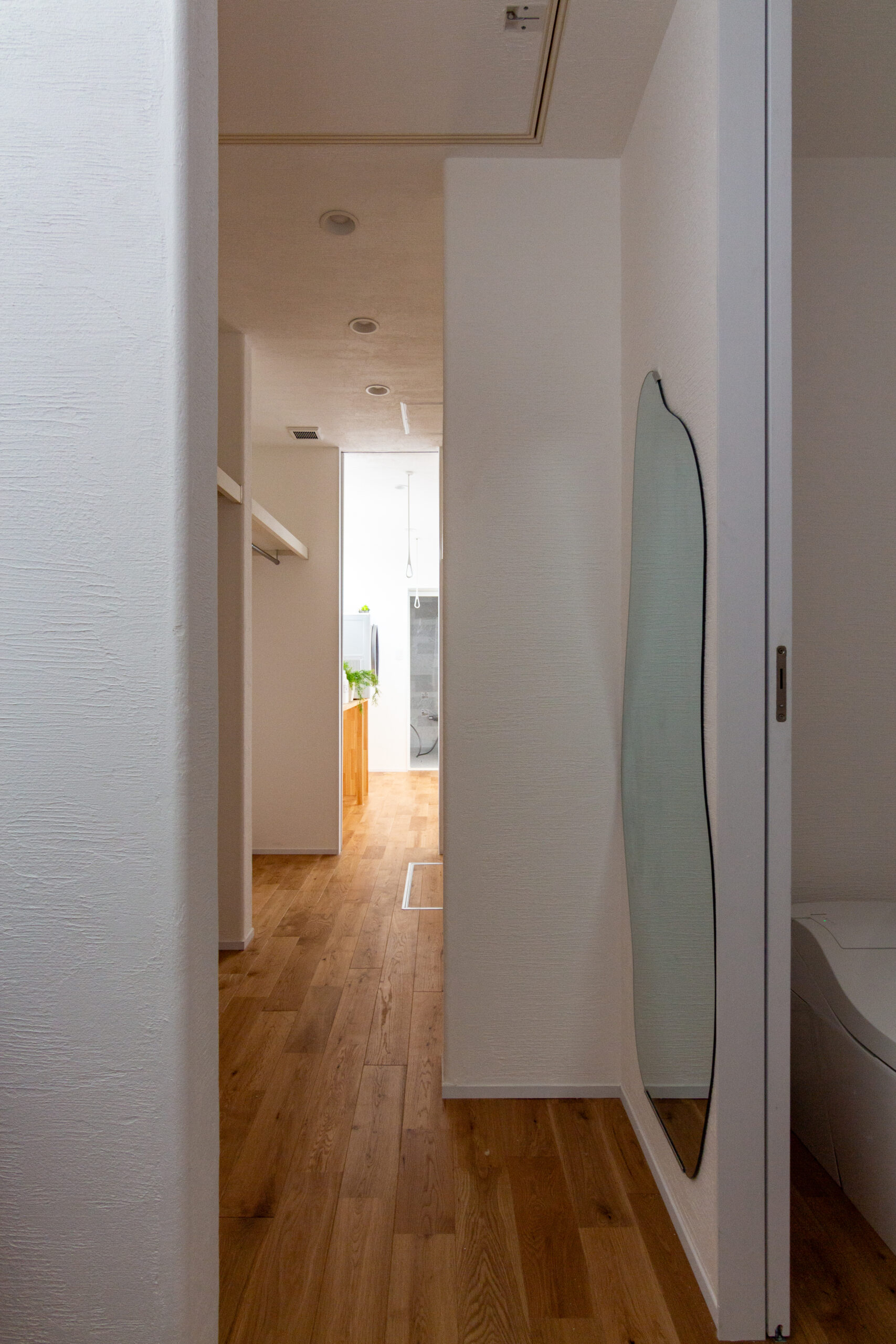 脱衣兼ランドリースペースとファミリークローゼットが横並びで一直線に繋がる配置は、家事の負担を大幅に軽減します。「洗う・乾かす・畳む・直す」の作業が数歩で完結し、日々の暮らしのなかに余白の時間を生み出す無駄のない動線設計です。