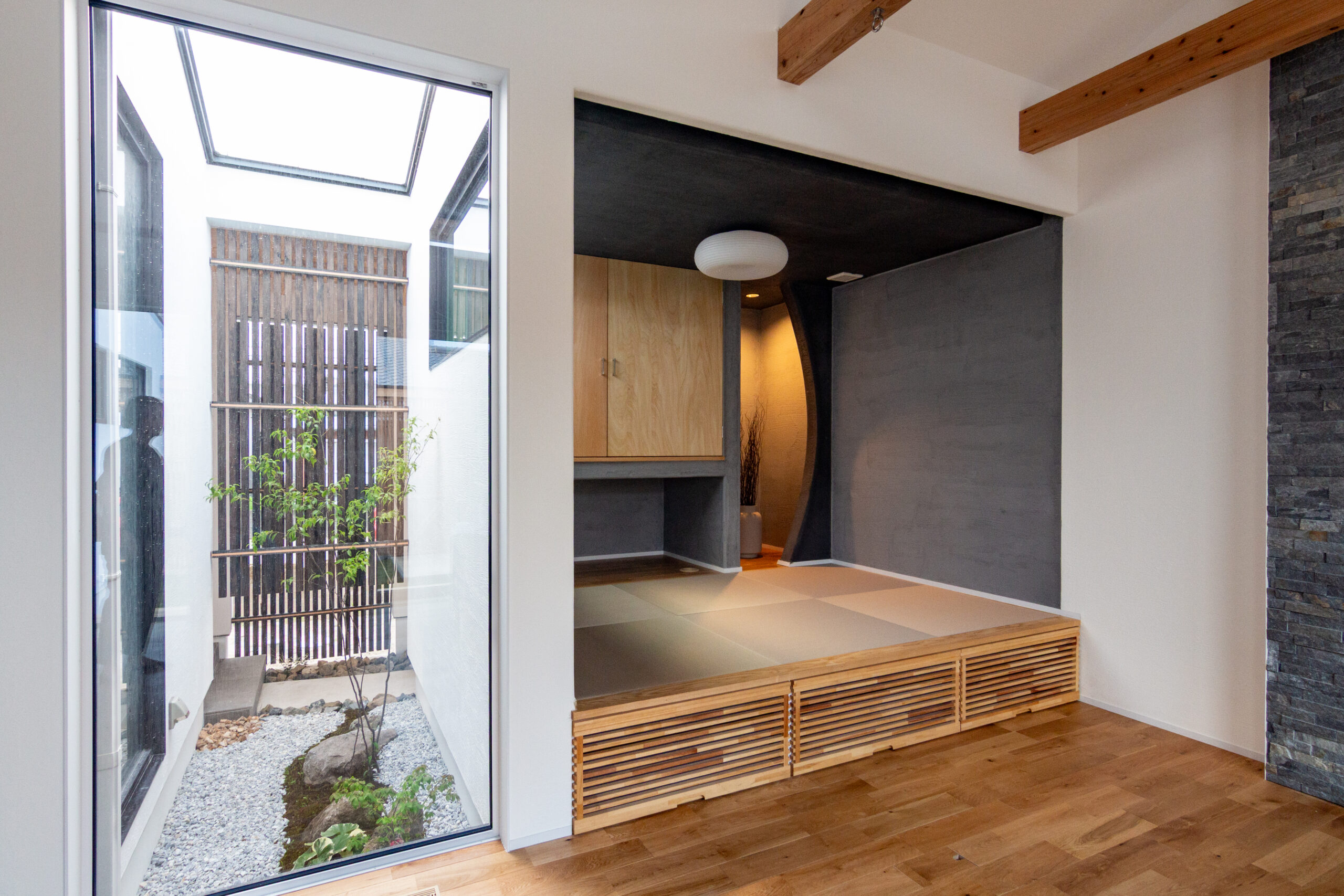 リビングの一角に設けられた小上がりの和室は、墨汁で淡く色付けた漆喰が空間に落ち着きをもたらします。ロールスクリーンでゆるやかに仕切ることもでき、来客時の寝室やお子様のお昼寝など、暮らしのシーンに合わせて多様に変化します。