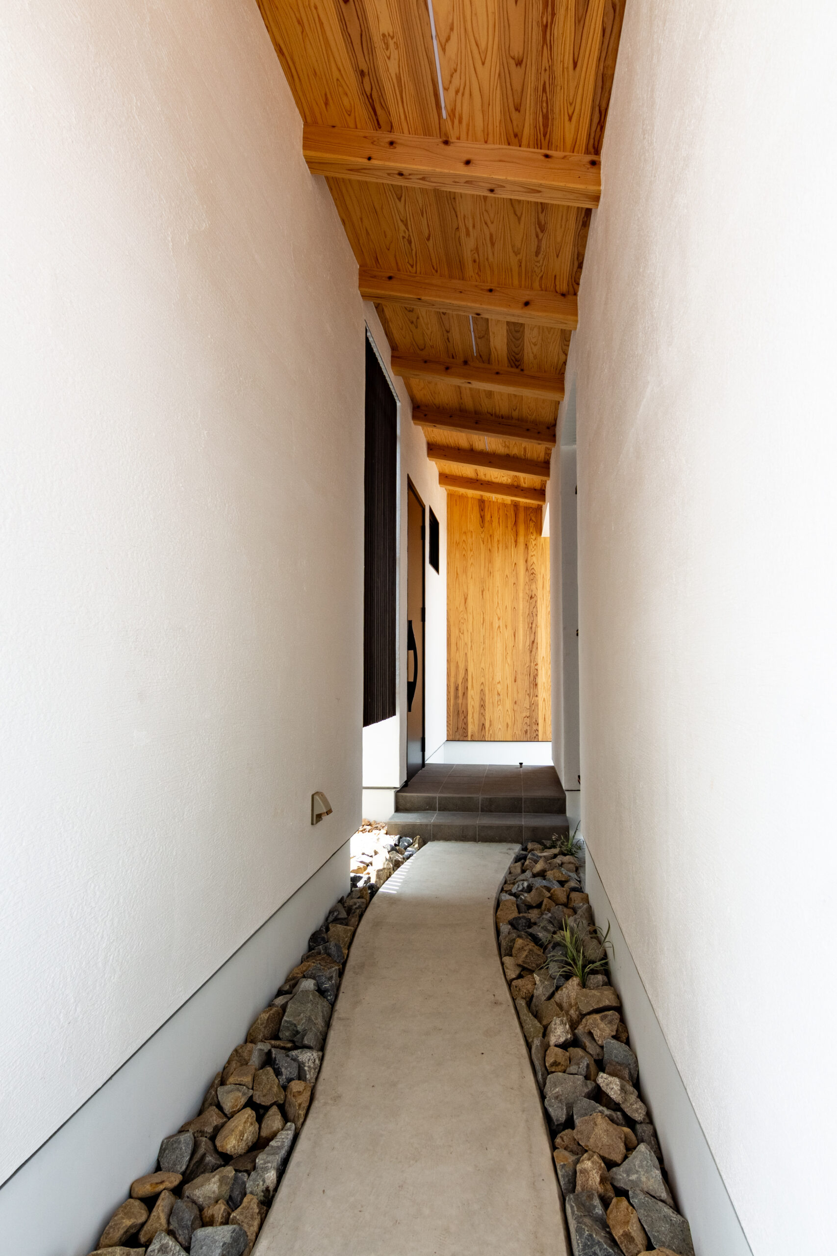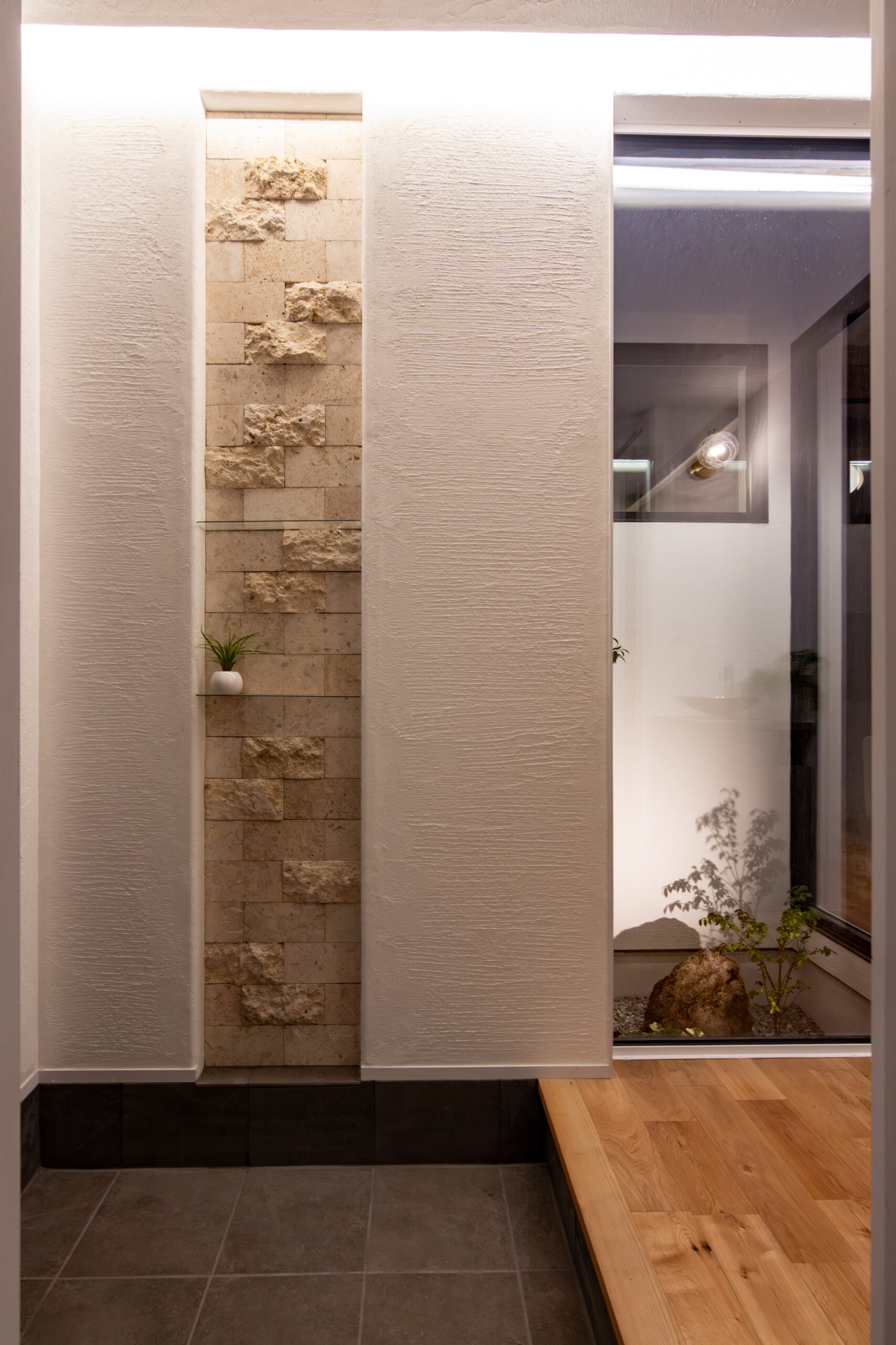 宮崎県産杉材の軒天が美しい小道を抜けると、外からは内部の様子が一切見えないプライバシーに配慮されたエントランスへとつながります。柔らかな光を落とす間接照明と坪庭が、帰宅する家族を優しく出迎え、オンとオフを穏やかに切り替えます。