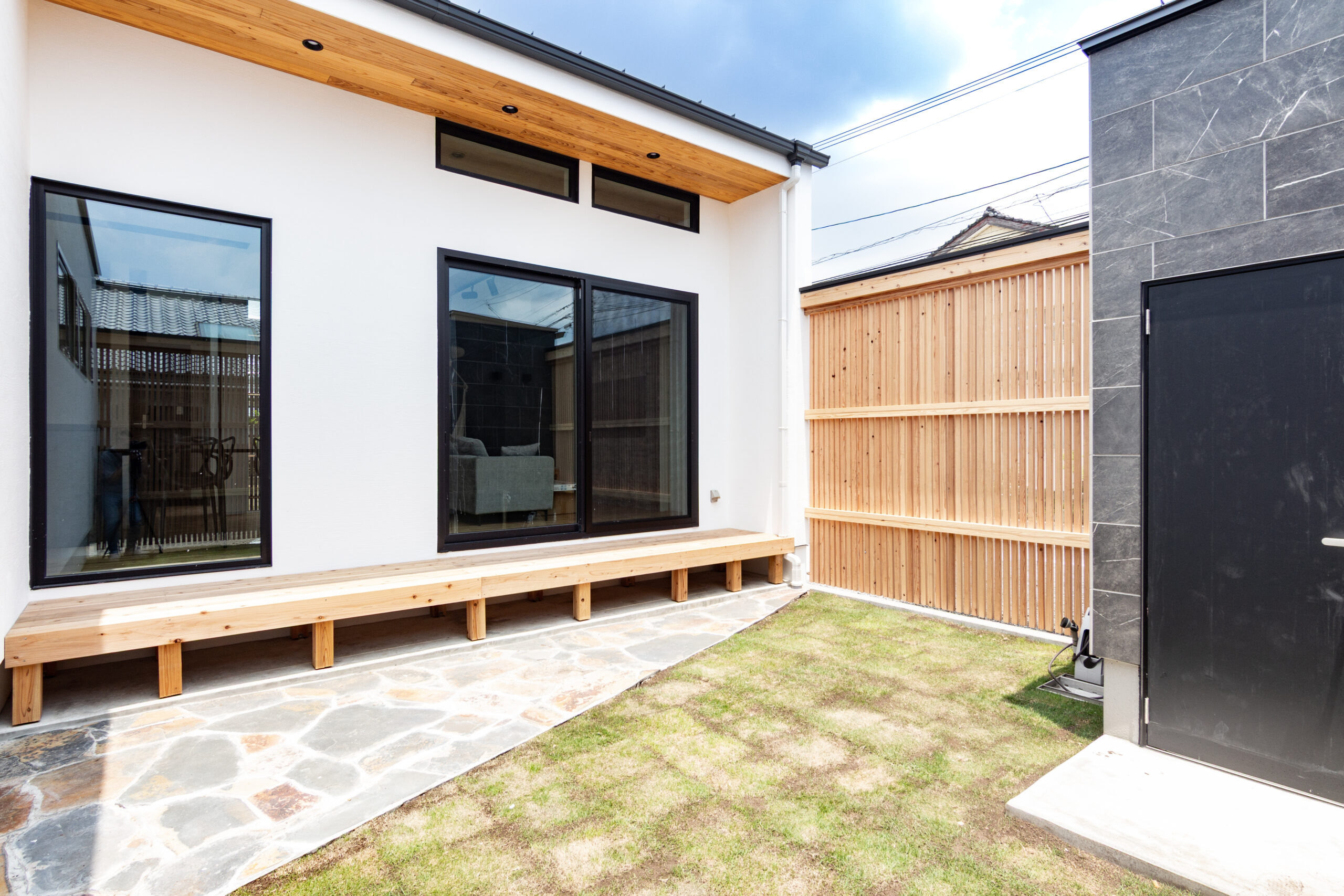 南面の大きな窓の先には、周囲の視線を気にせず空を仰ぐことができるプライベートな中庭空間が広がります。天然石をあしらった外部倉庫と連続し、ご家族でのバーベキューや休日の穏やかな時間を気兼ねなく楽しめる場所です。