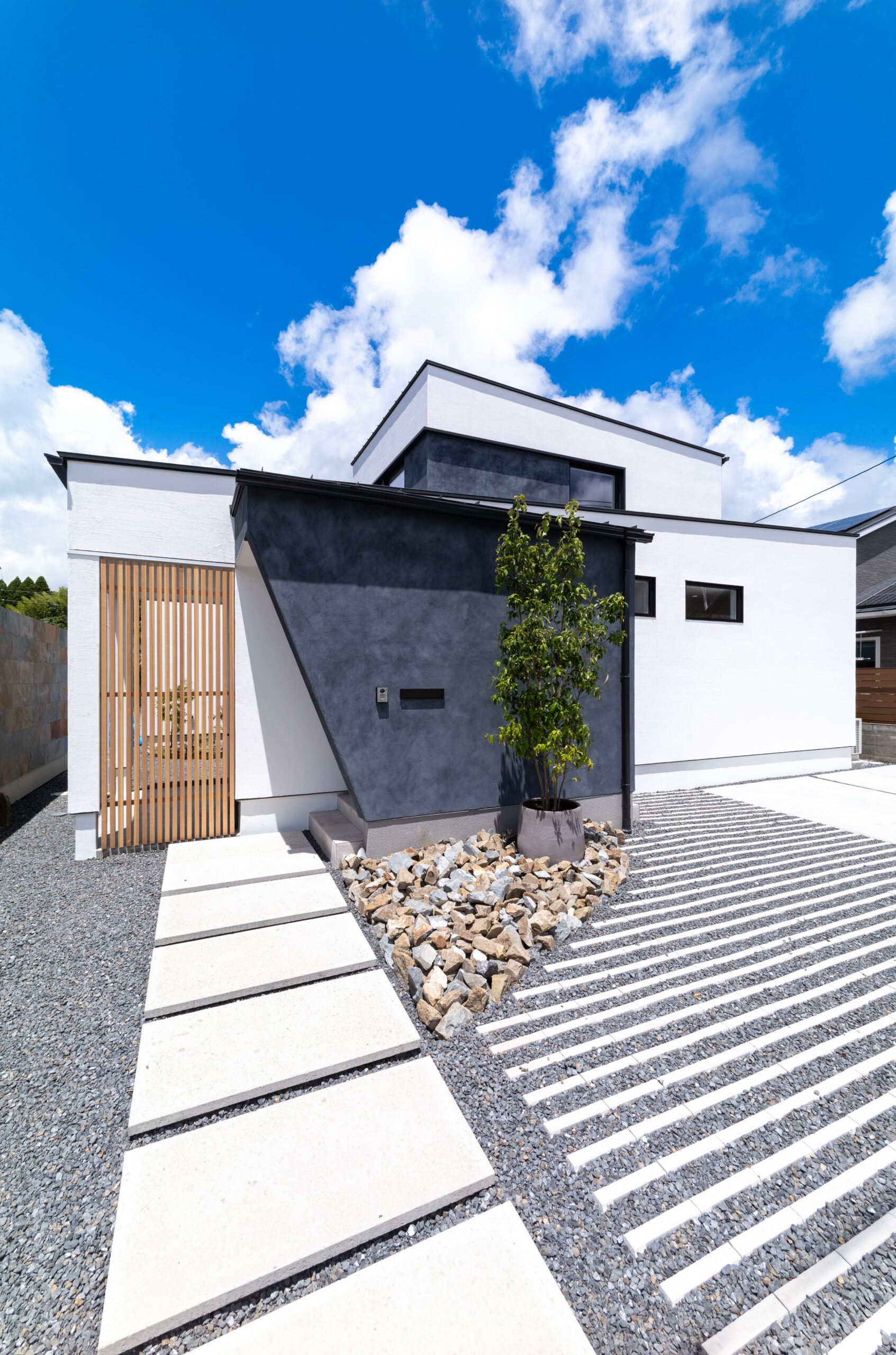 青空に美しく映える白い塗り壁に、深いグレーの壁面が引き締まった印象を与える外観。木の格子をあしらった門扉と、足元を飾る石材のアプローチが、訪れる人を優しく邸内へと導きます。洗練された直線的なフォルムの中に、素材の温かみを感じさせるデザインです。