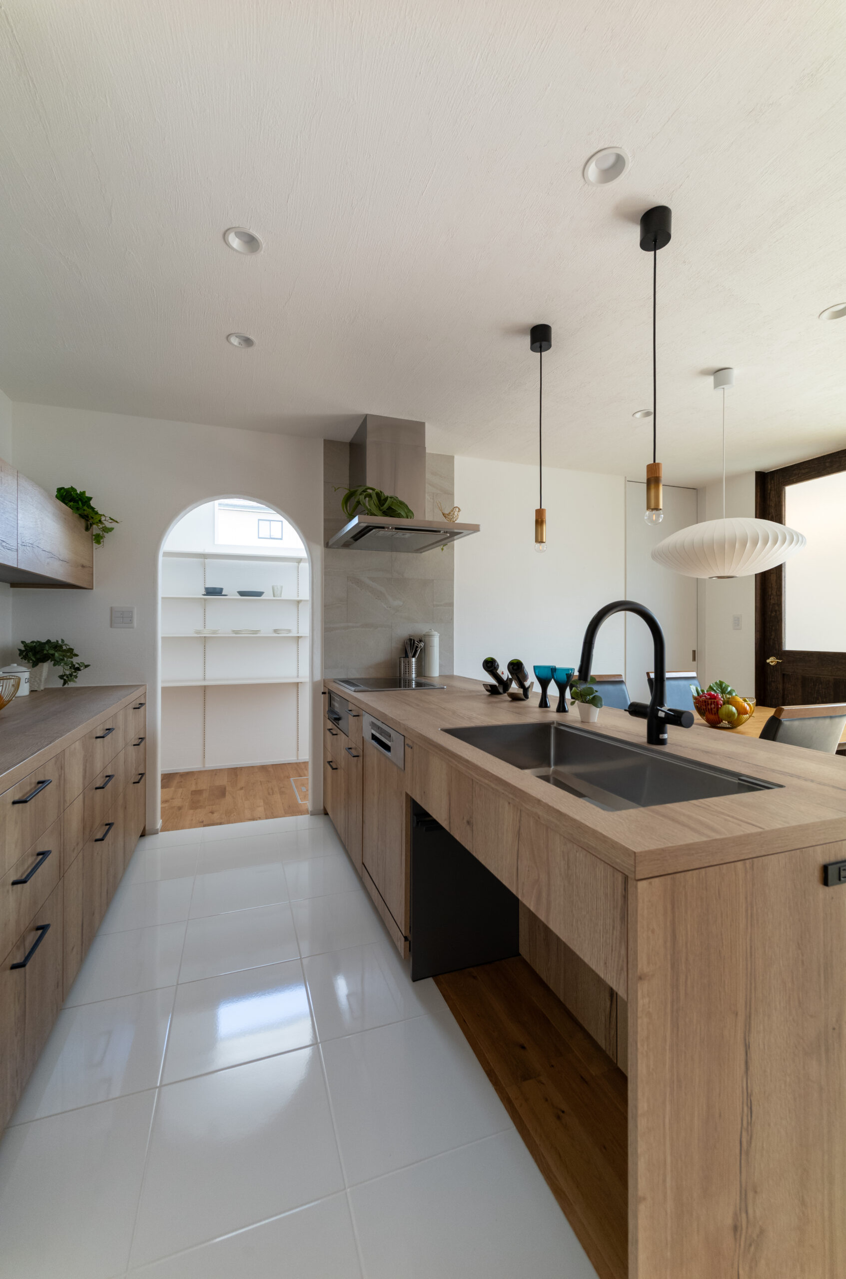 木の質感が魅力のフルフラットキッチンは、視線が奥まで抜け、空間をより広く感じさせます。その奥に続くパントリーへの入り口は、柔らかなアーチ型に。白を基調とした清潔感のある空間に、計算された曲線のデザインが上品なアクセントを加えています。