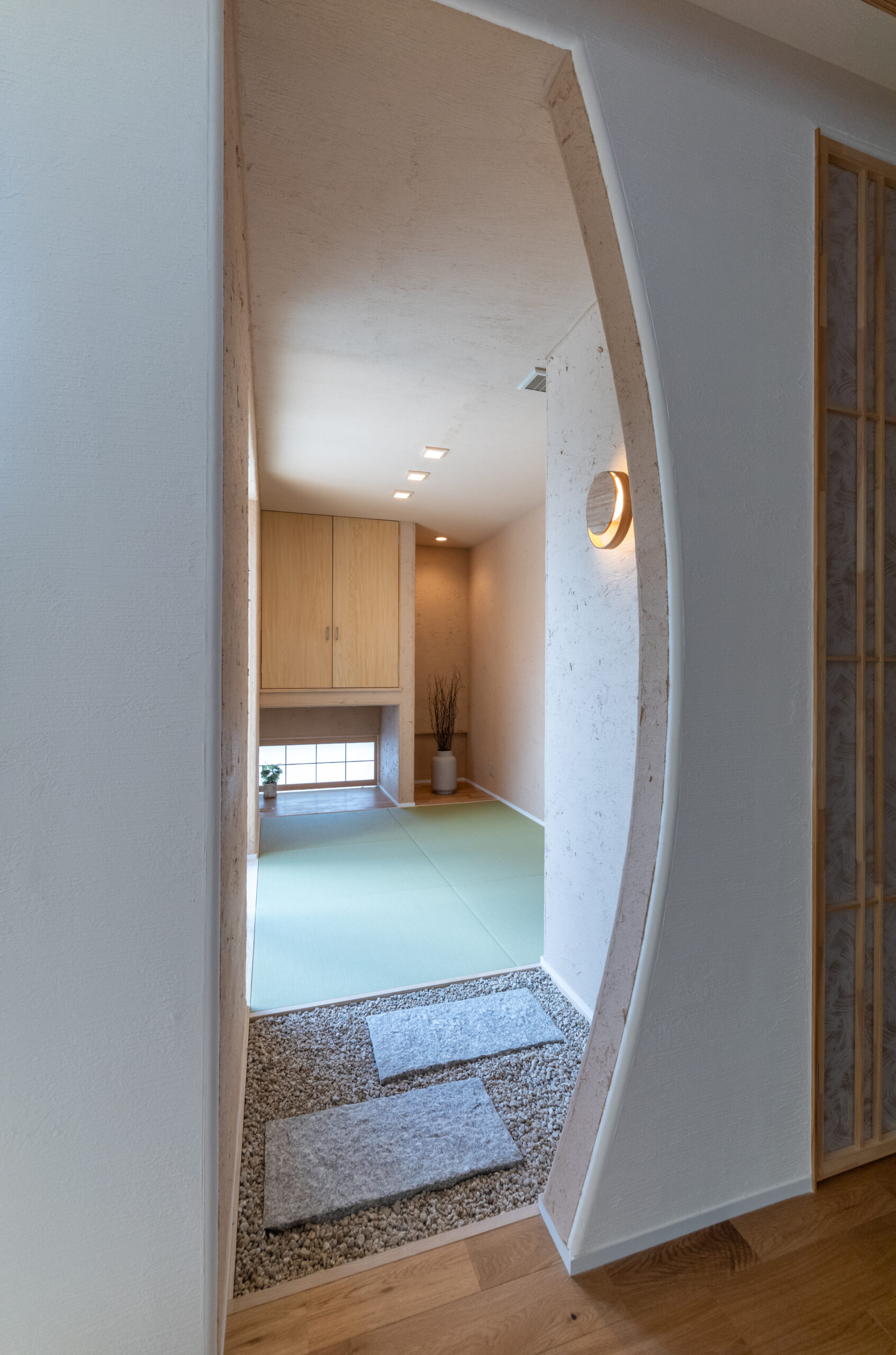 美しい弧を描く入り口を抜けると、そこには心落ち着く畳の空間が広がります。足元に敷き詰められた玉砂利と石材が、まるで洗練された宿を訪れたかのような非日常感を演出。壁面に灯る柔らかな間接照明が、静かで上質なひとときを彩ります。