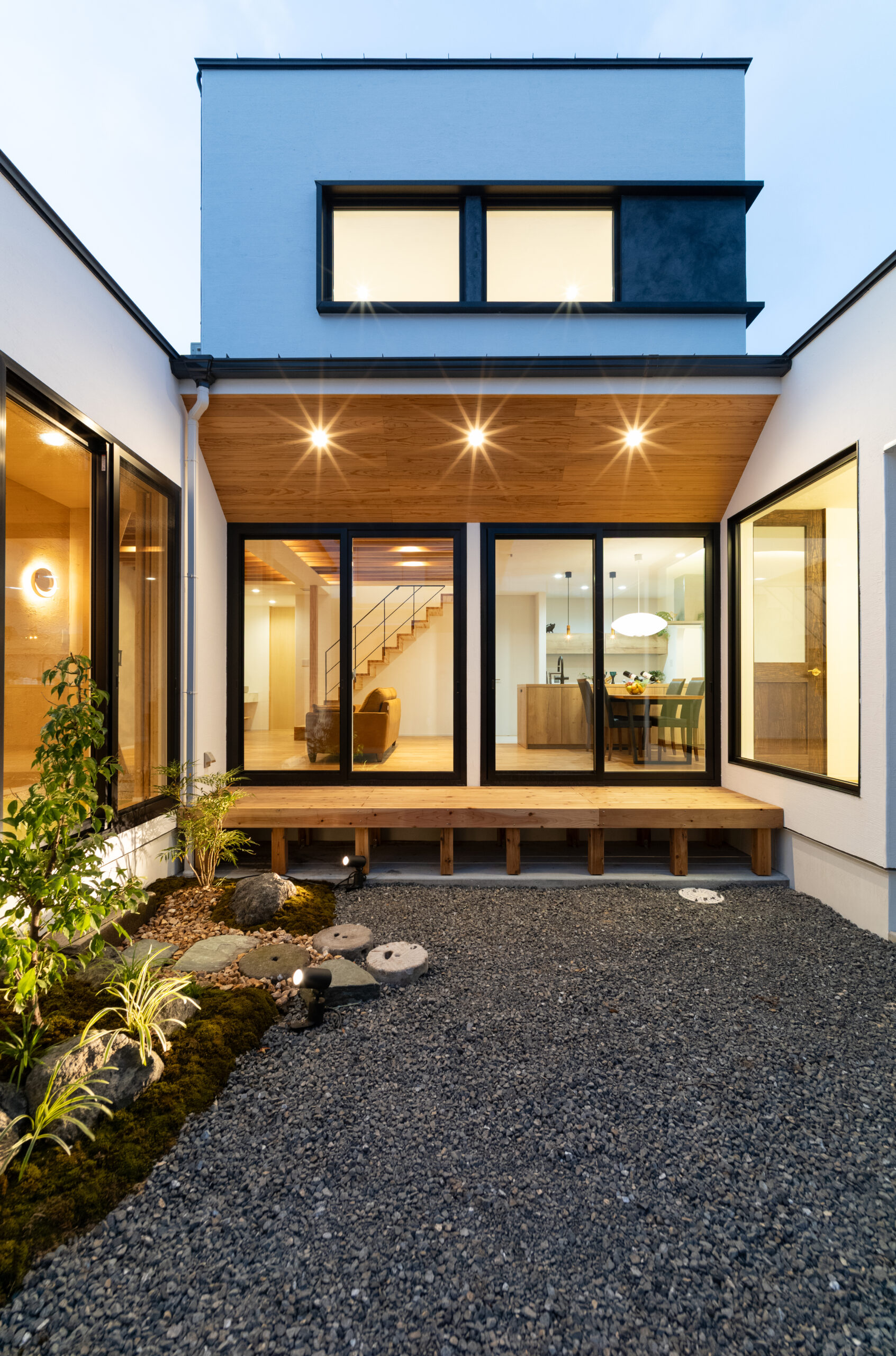 室内からウッドデッキ、そして中庭へとフラットに続く空間が、内と外の境界を曖昧にし、暮らしに深い広がりをもたらします。深く確保された軒下の明かりが、趣のある植栽を美しく照らし出す夜の風景。季節の風や自然の気配を感じながら、穏やかなプライベートタイムを過ごせる空間です。