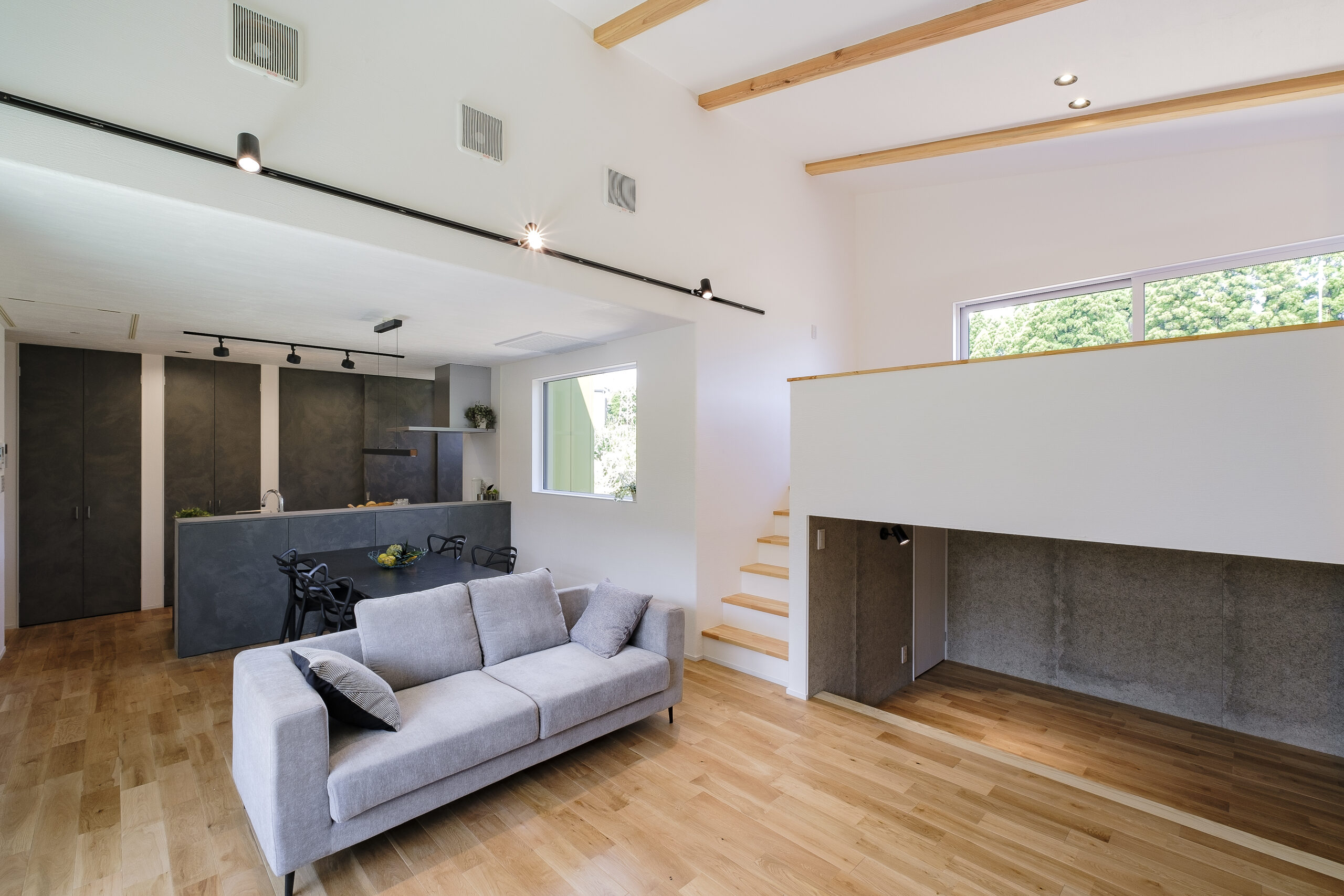 閉鎖的な外観から一転、室内には伸びやかな天井高を活かした開放的な空間が広がります。テレビボード背面には鉄黒のテクスチャーが美しい壁材を天井まであしらい、空間をより高く、立体的に見せる工夫を施しました。フロアコンセントを床に馴染むよう造作するなど、視覚的なノイズを排除した洗練された意匠が、心からのくつろぎをもたらします。