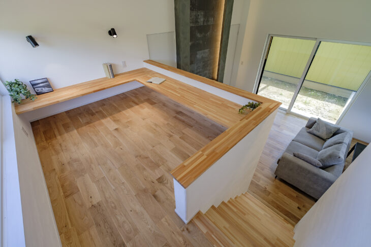 階段下のスペースを活かした天井高1.4mのヌックは、木の風合いを感じる素材で仕上げた落ち着きのある居場所です。その上部に広がる中2階には、キッチンからの視線が届く開放的なカウンターデスクを設置