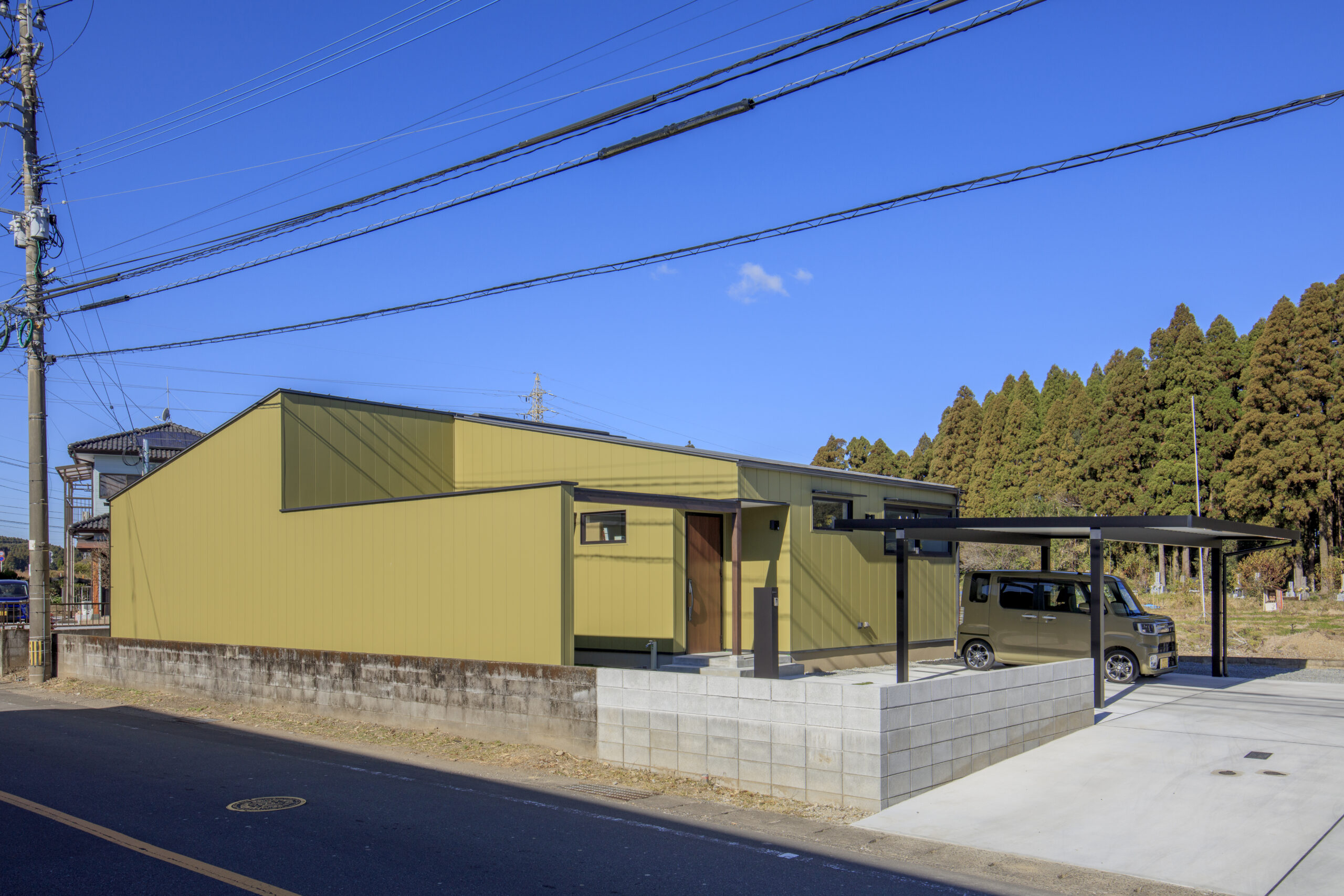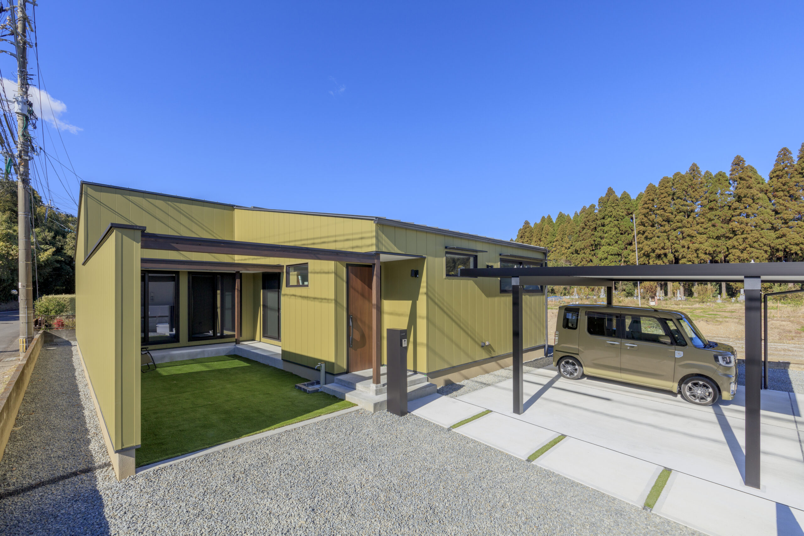 交通量の多い南側の道路に対して大きく壁を立ち上げ、外からは中の様子がうかがえない設計に。背後の杉林と調和するモスグリーンの外観は、まるで家族だけの秘密基地のようなワクワク感を生み出します。外からの視線や喧騒を静かに弾き返し、その奥に広がる心地よい空間への期待を高めてくれる美しい構えです。