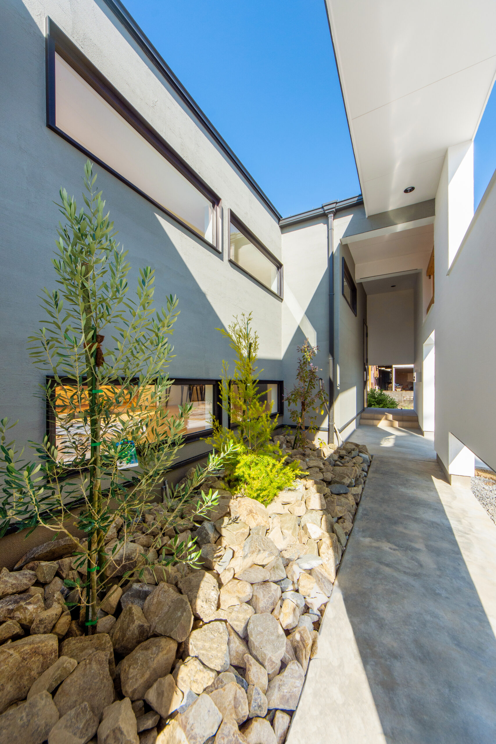 入り口を抜けると、自然石とオリーブなどの木々がバランスよく配置されたアプローチが広がります。外からの視線を遮りながらも、ふと見上げれば空へと視線が抜ける心地よい空間。足元の地窓は、室内にいる家族へも緑の景色を届けるためのもの。歩く楽しさだけでなく、家の中からの美しい見え方まで計算された設計です。
