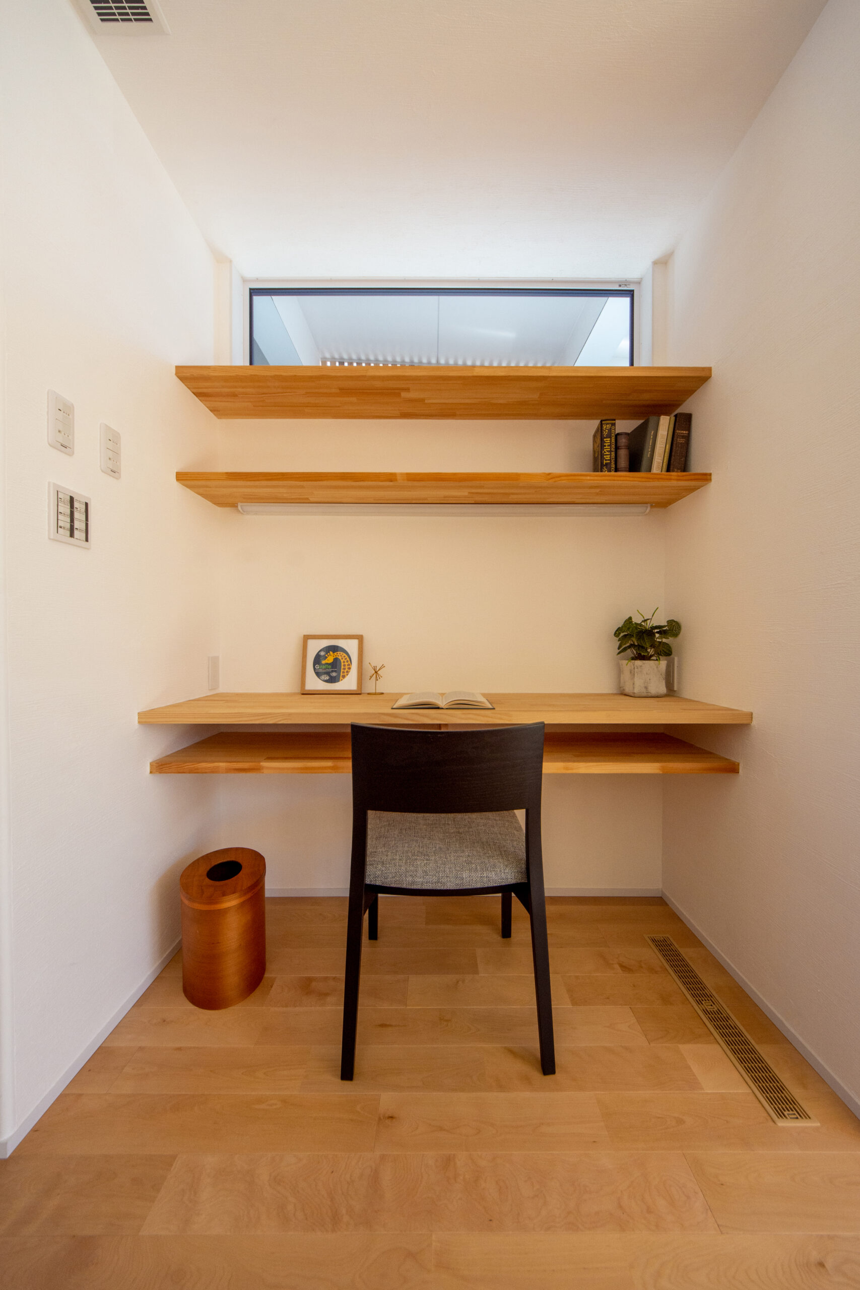 キッチンのすぐ傍らに設けたのは、無垢の木で造り付けたデスクと棚が馴染むワークスペース。高い位置にある窓から手元に自然光が届き、日中も気持ちよく作業に向かえます。家事の合間のちょっとした調べ物や、お子様の学習スペースとして。家族の気配をほどよく感じながら、それぞれの時間を大切にできる便利な一角です。