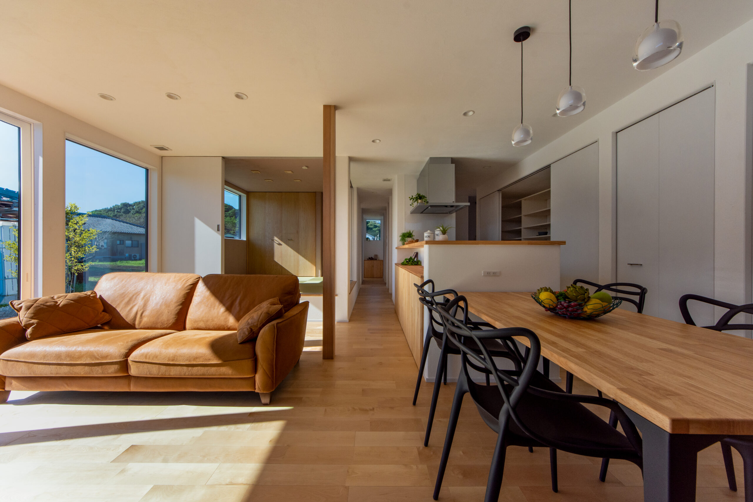 東側に大きく設けた窓から柔らかな自然光が入り込み、無垢の床や漆喰の壁を明るく照らすLDK。生活感が出やすい日用品や家電は、すべて扉付きの大容量収納へ収まるように設計しています。空間のノイズをすっきりと隠すことで、窓辺の緑や家族との穏やかな時間を主役にする、心地よい居場所です。