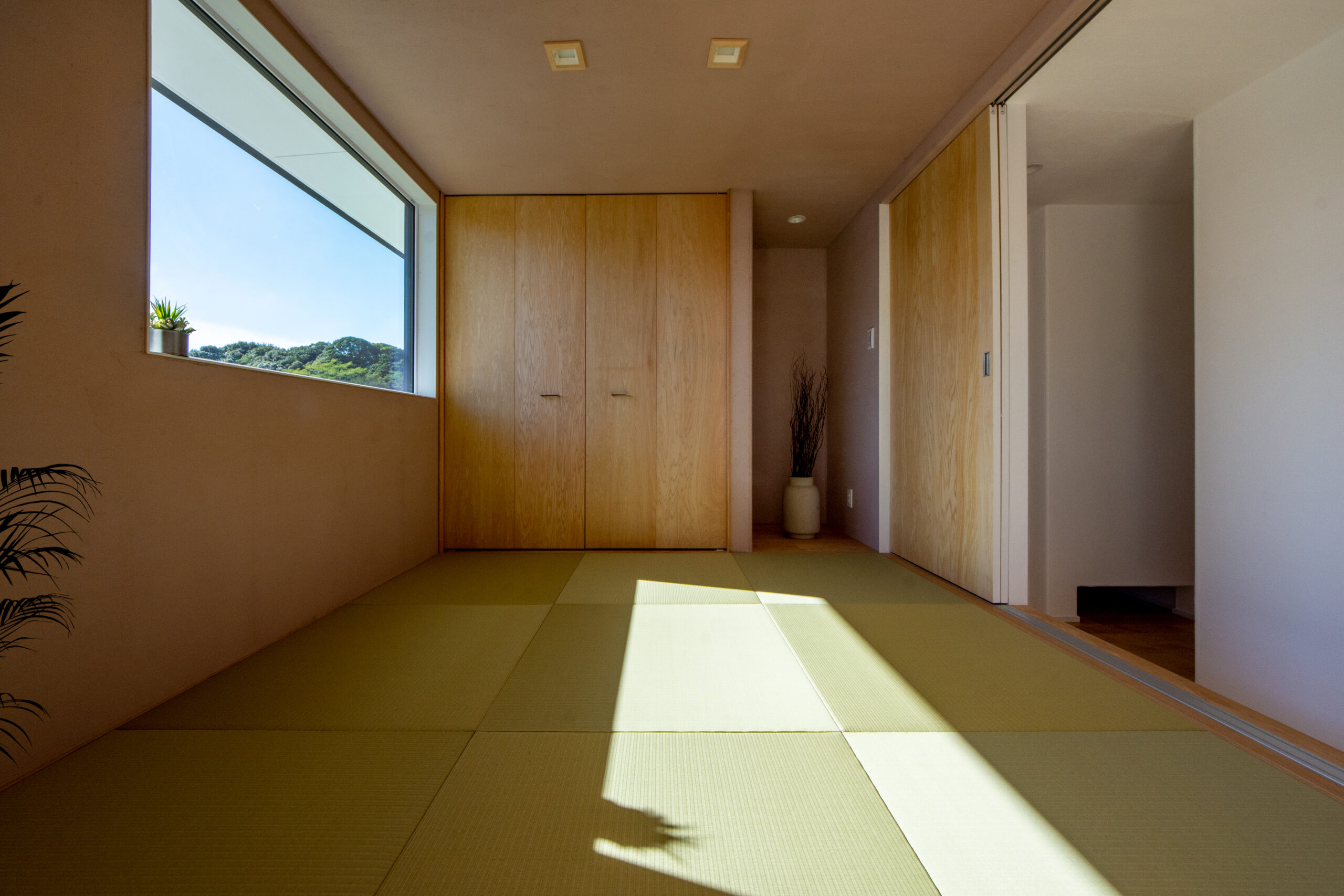 空と緑を切り取る美しい白壁の平屋。光と心地よい余白に包まれて暮らす住まい